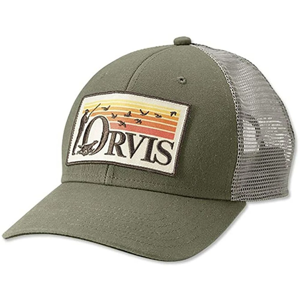 Features Orvis’s upland logo with an Orvis hunter and flushing birds against a colorful sunrise. Trucker style with snap strap. One size fits most. Cotton front and visor, polyester mesh. Spot clean. Imported.